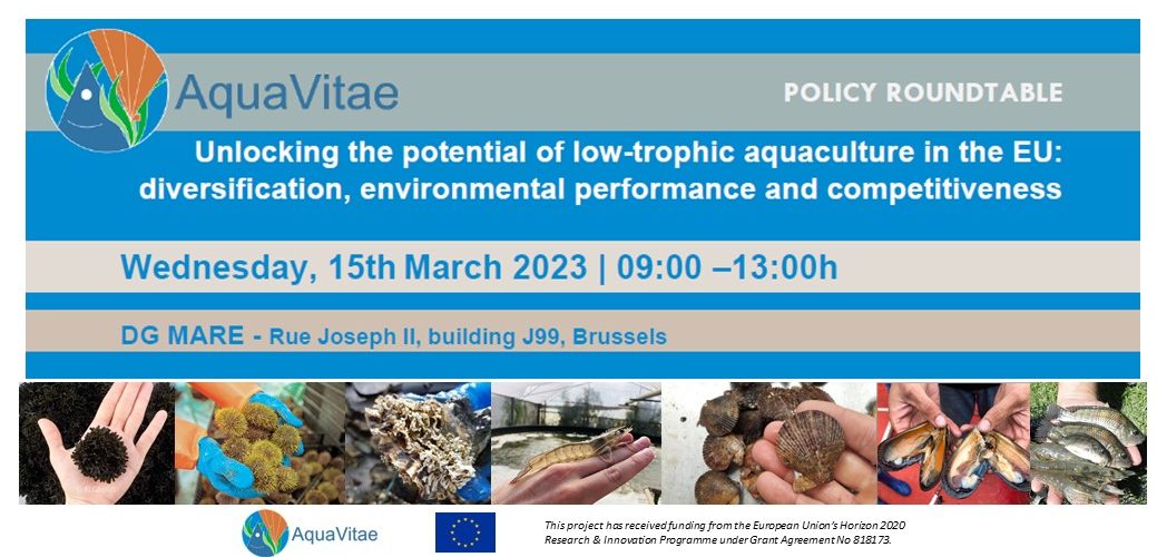 On March 15th, 2023, the AquaVitae Consortium will hold a policy roundtable titled “Unlocking the potential of low-trophic aquaculture in the EU: diversification, environmental performance and competitiveness”. The event will take place at DG MARE in Brussels, Belgium, from 09:00 to 13:00 hours.