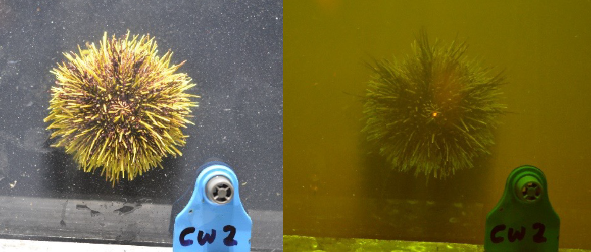 The preliminary results are promising, showing that fluorescence levels do change in response to such factors. This has been surprising particularly in the green sea urchin, which produces a diffuse fluorescence in the connective tissue surround the spines and an intense red fluorescence within the coelomic fluid.