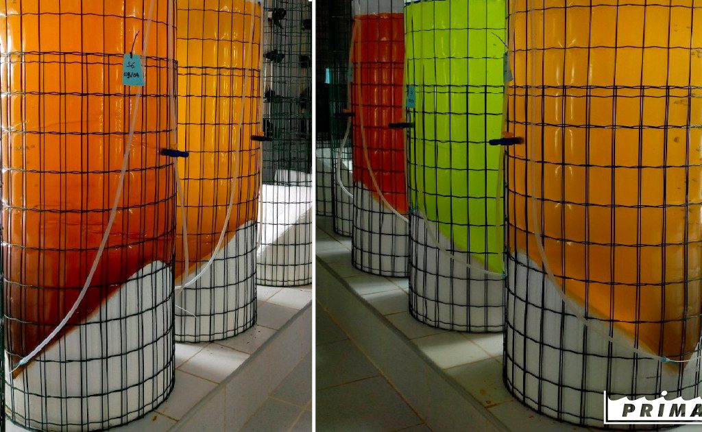 First growth test with the native microalgae on 300 litres bags at Primar´s hatchery. Photo credit: Marcia Kafensztok.